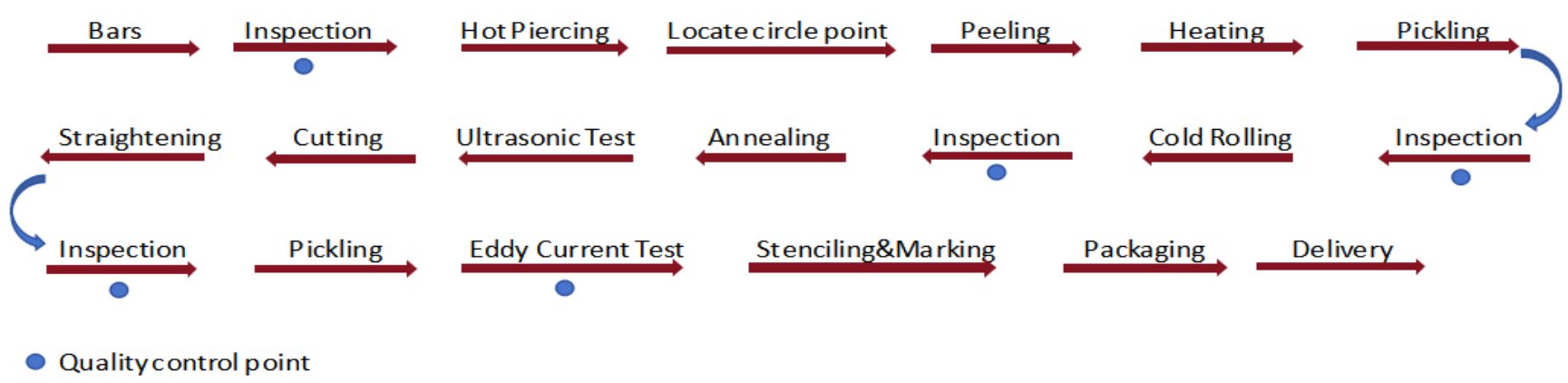 The round steel bar is used to produce seamless pipe. After heating the bar to a high temperature, a probe is put into the bar to produce a hole. The cylinder is then moved to rollers that shape it to the required diameter and wall thickness.
